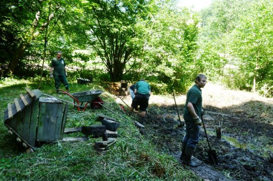 Im Karlstal nahe Stelzenberg trafen sich am Dienstag, den 24. Juni, ein Dutzend Waldläufer aus Zweibrücken um zwei alte Forellenteiche freizustellen. Die Maßnahme dient dem Erhalt des Lebensraumes seltener Amphibienarten.
