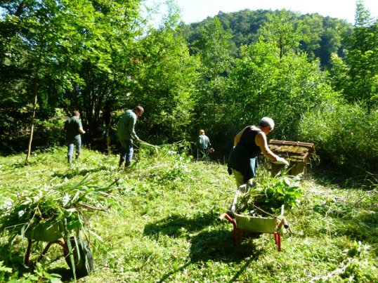 Die fleißigen Helfer beim Wegtragen der abgeschnitten Hecken.