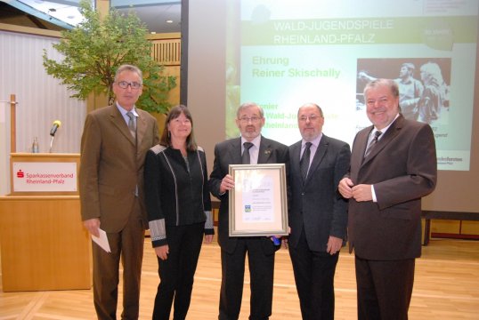 Reiner Skischally, in Waldjugendkreises besser bekannt als Charly, erhielt im Rahmen der Landessiegerehrung der Wald-Jugendspiele eine besondere Auszeichnung für sein langjähriges Engagement für die Wald-Jugendspiele und seinen Einsatz für Wald und Jugend in Rheinland-Pfalz. Ministerpräsident Beck überreichte ihm die Goldene Ehrennadel der Schutzgemeinschaft Deutscher Wald. „Die Schutzgemeinschaft kann sich glücklich schätzen, einen Mann wie Rainer Skischally in ihren Reihen zu haben. Als Pionier forstlicher Umweltbildung in Rheinland-Pfalz hatte er maßgeblichen Anteil daran, die Wald-Jugendspiele in Rheinland-Pfalz zu etablieren und zu ihrem Erfolg zu führen“, betonte Landrat Werner in seiner Laudatio.